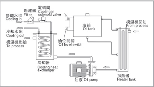 以上參數(shù)若有變更,恕不另行通知 The specification is suject to change without prior notification 可根據(jù)客戶要求,訂做各種非標(biāo)模具溫控機(jī),如高溫模溫機(jī),負(fù)壓模溫機(jī),精密模溫機(jī) 工作原理圖 Schematic diagram